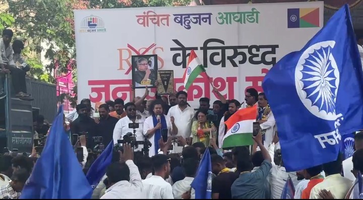 मोर्चासाठी मोठ्या प्रमाणात गर्दी झाली असून, वंचित बहुजन आघाडीचे कार्यकर्ते हातात फलक घेऊन जोरदार घोषणाबाजी करत आहेत.