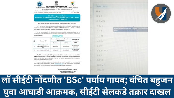 लॉ सीईटी नोंदणीत 'BSc' पर्याय गायब; वंचित बहुजन युवा आघाडी आक्रमक, सीईटी सेलकडे तक्रार दाखल