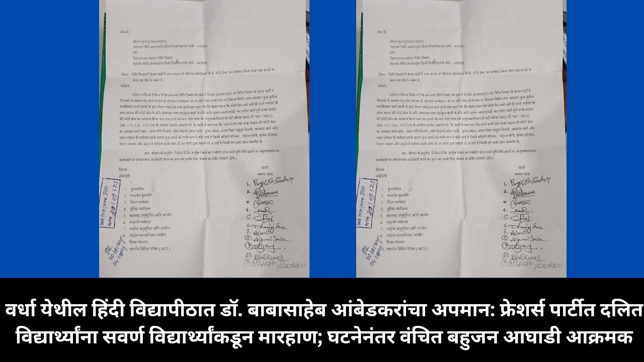 वर्धा : महात्मा गांधी आंतरराष्ट्रीय हिंदी विद्यापीठ, वर्धा (महाराष्ट्र) च्या विधी विभागात आयोजित फ्रेशर्स पार्टीदरम्यान काही असामाजिक तत्वांनी संविधान निर्माते, भारतरत्न डॉ. बाबासाहेब आंबेडकर यांचा अपमान केल्याचा गंभीर प्रकार उघडकीस आला आहे. या घटनेमुळे विद्यापीठात तणावाचे वातावरण निर्माण झाले आहे.