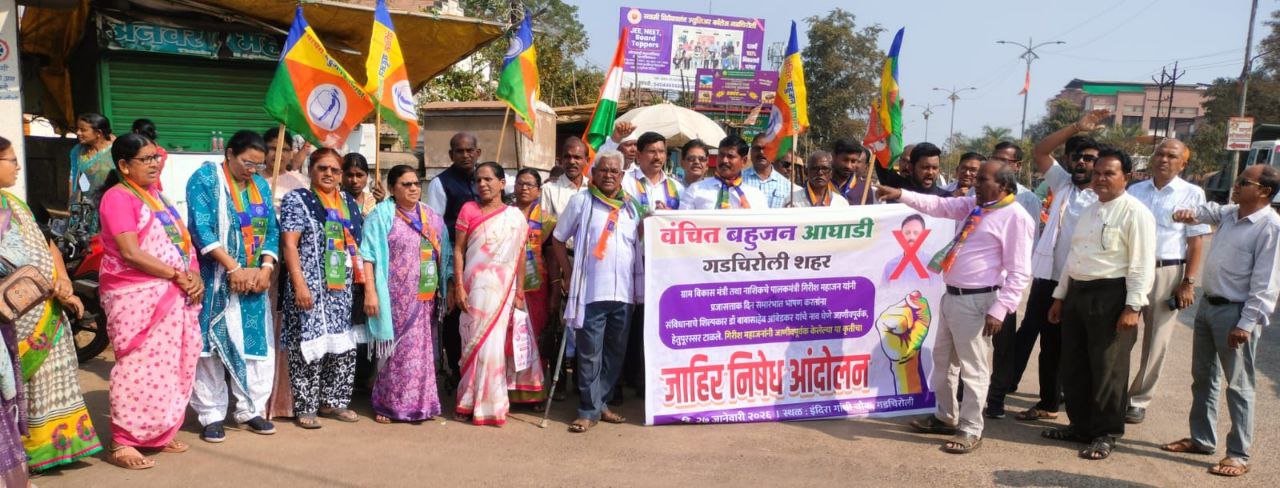 नाशिक येथील प्रजासत्ताक दिन सोहळ्यात राज्याचे ग्रामविकास मंत्री तथा पालकमंत्री गिरीश महाजन यांनी आपल्या भाषणातून भारतीय राज्यघटनेचे शिल्पकार डॉ. बाबासाहेब आंबेडकर यांचे नाव जाणीवपूर्वक टाळल्याचा आरोप करत, गडचिरोलीत वंचित बहुजन आघाडीच्या वतीने तीव्र निदर्शने करण्यात आली. येथील स्थानिक इंदिरा गांधी चौकात जमलेल्या कार्यकर्त्यांनी गिरीश महाजन यांच्याविरोधात जोरदार घोषणाबाजी करत त्यांच्यावर ‘अॅट्रॉसिटी’ कायद्यांतर्गत गुन्हा दाखल करण्याची मागणी केली.