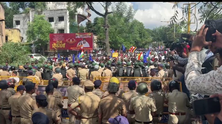 आमनेसामनेहा ‘जन आक्रोश मोर्चा’ आरएसएसच्या कार्यालयाकडे (बाबा पेट्रोल पंप जवळ) जात असताना पोलिसांनी मोठा बंदोबस्त लावत गर्दीला कार्यालयाकडे जाण्यापासून अडवले. या अडवणुकीमुळे वंचित बहुजन आघाडीचे कार्यकर्ते आणि पोलिस आमनेसामने आले.