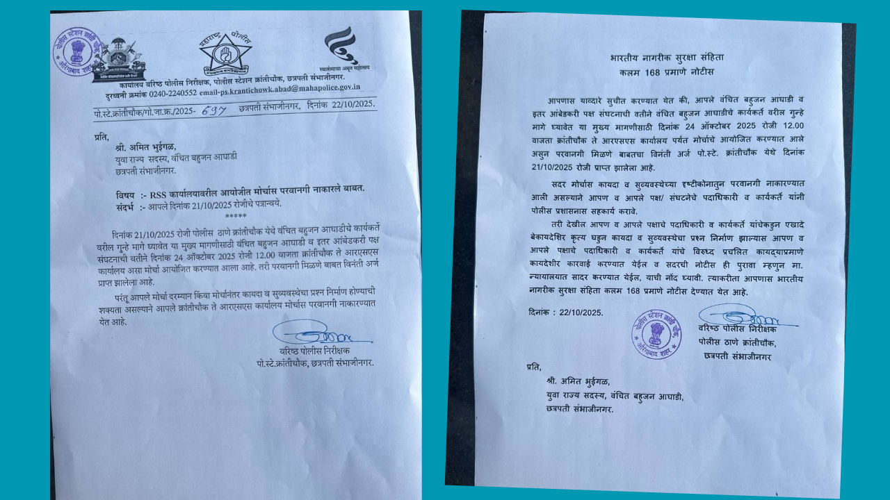 औरंगाबाद : वंचित बहुजन आघाडीच्या जन आक्रोश मोर्च्याला पोलिसांनी परवानगी नाकारली आहे. वंचित बहुजन आघाडीच्यावतीने 24 ऑक्टोबर २०२५ रोजी क्रांतीचौक ते RSS कार्यालय असा मोर्चा आयोजित करण्याची केलेली विनंती क्रांतीचौक पोलीस ठाण्याने फेटाळली आहे. कायदा व सुव्यवस्थेचा प्रश्न निर्माण होण्याची शक्यता लक्षात घेऊन हा निर्णय घेण्यात आला आहे.