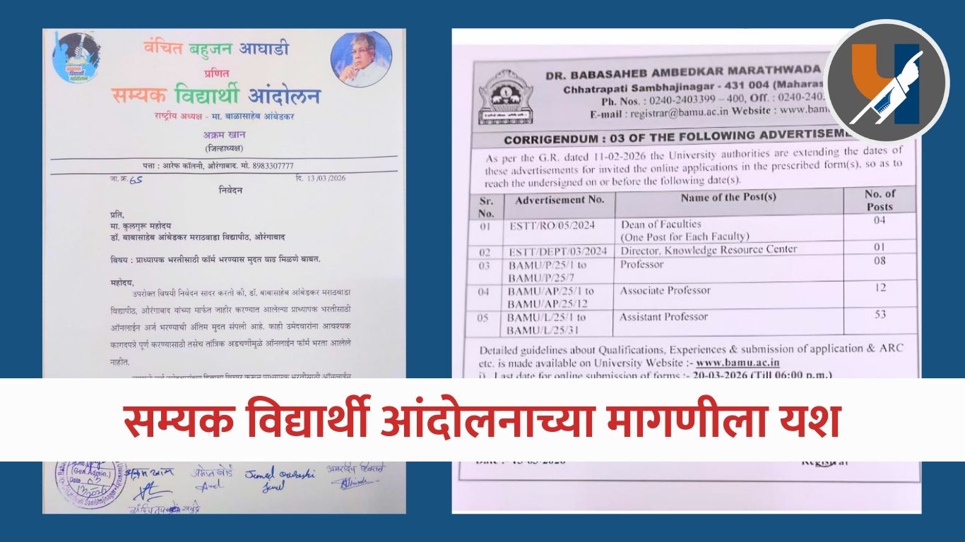 विद्यापीठ प्रशासनाने या मागणीची दखल घेत प्राध्यापक भरतीसाठी ऑनलाईन अर्ज भरण्याची अंतिम मुदत 20 मार्च 2026 पर्यंत वाढविण्याचा निर्णय घेतला आहे. या निवेदनावर सम्यक विद्यार्थी आंदोलनचे जिल्हाध्यक्ष अक्रम खान यांच्यासह अमरदीप हिवराळे, संदीप तुपसंमुद्रे, अमोल बोर्डे आणि जुनेद कुरेशी यांच्या स्वाक्षऱ्या आहेत.