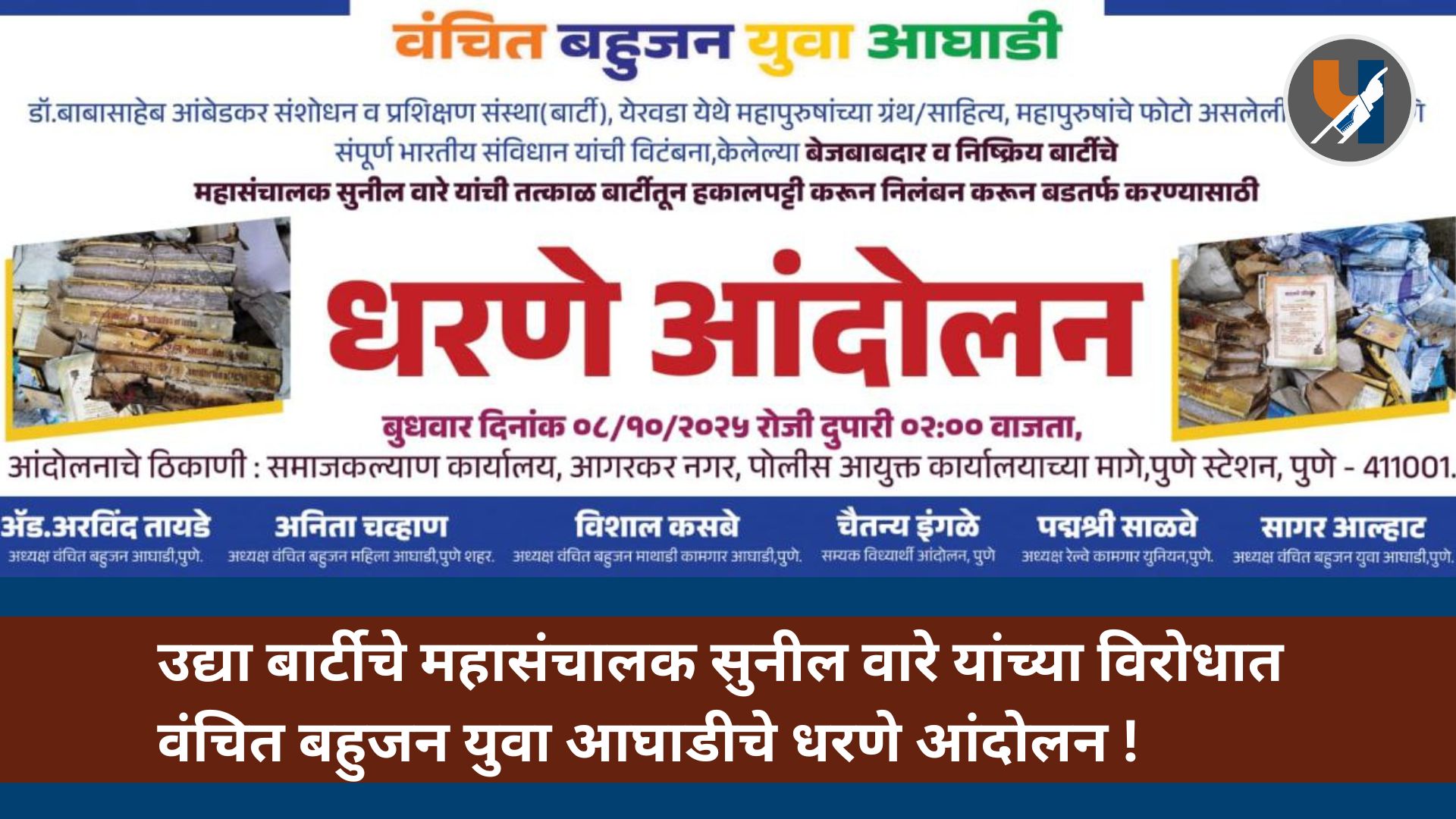 या पार्श्वभूमीवर “सुनील वारे हटाव – बार्टी बचाव” या घोषवाक्याखाली बुधवार, दिनांक ८ ऑक्टोबर २०२५ रोजी दुपारी २ वाजता समाजकल्याण कार्यालय, आगरकर नगर (पोलीस आयुक्त कार्यालयाच्या मागे, पुणे स्टेशन) येथे धरणे आंदोलन आयोजित करण्यात आले आहे.