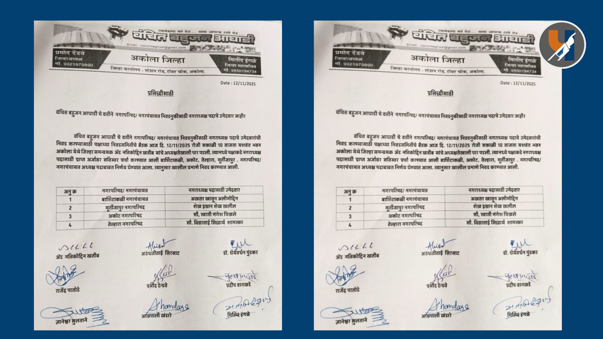 अकोला : आगामी नगरपरिषद/नगरपंचायत निवडणुकीच्या पार्श्वभूमीवर वंचित बहुजन आघाडी या वतीने नगराध्यक्ष पदासाठी आपल्या उमेदवारांची पहिली यादी आज, बुधवार, दिनांक १२ नोव्हेंबर २०२५ रोजी जाहीर केली.