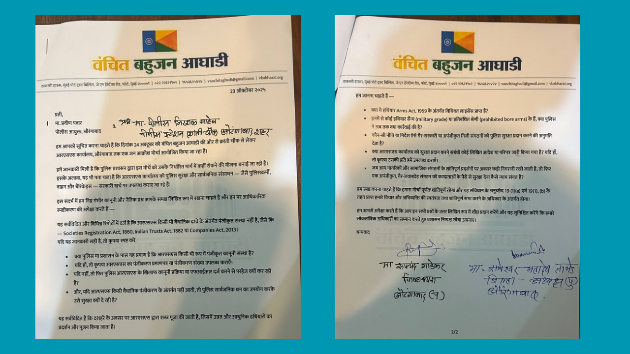 औरंगाबाद : वंचित बहुजन आघाडी (VBA) ने दिनांक २४ ऑक्टोबर रोजी क्रांती चौक ते राष्ट्रीय स्वयंसेवक संघाचे (RSS) कार्यालय, औरंगाबाद, पर्यंत आयोजित केलेल्या ‘जन आक्रोश मोर्चा’च्या अनुषंगाने शहराच्या पोलीस प्रशासनाच्या भूमिकेवर गंभीर कायदेशीर आणि नैतिक प्रश्न उपस्थित झाले आहेत. वंचित बहुजन आघाडीच्यावतीने पोलीस निरीक्षक, क्रांती चौक पोलीस स्टेशन यांना लेखी निवेदन देऊन राष्ट्रीय स्वयंसेवक संघाला (RSS) पुरवण्यात येत असलेल्या कथित पोलीस संरक्षण आणि सार्वजनिक संसाधनांच्या वापराबाबत तातडीने अधिकृत स्पष्टीकरण देण्याची मागणी केली आहे.