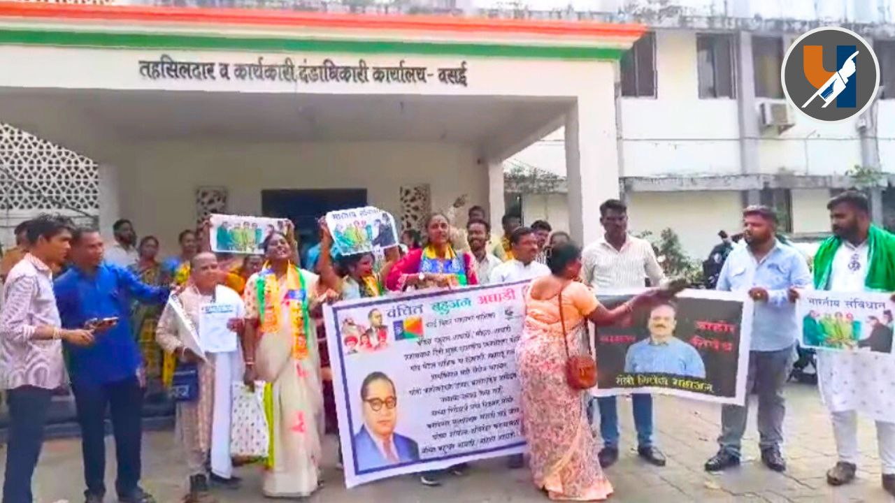 वसई : प्रजासत्ताक दिनी नाशिक येथील शासकीय कार्यक्रमात भारतीय संविधानाचे शिल्पकार डॉ. बाबासाहेब आंबेडकर यांचे नाव जाणीवपूर्वक टाळणाऱ्या मंत्री गिरीश महाजन आणि त्या ‘मनुवादी’ मानसिकतेचा वसईत तीव्र निषेध करण्यात आला. वंचित बहुजन महिला आघाडीच्या वतीने यावेळी मंत्र्यांच्या वृत्तीचा ‘जोडे मारून’ निषेध व्यक्त करण्यात आला. या आंदोलनामुळे तहसील कार्यालय परिसर दणाणून गेला होता.
