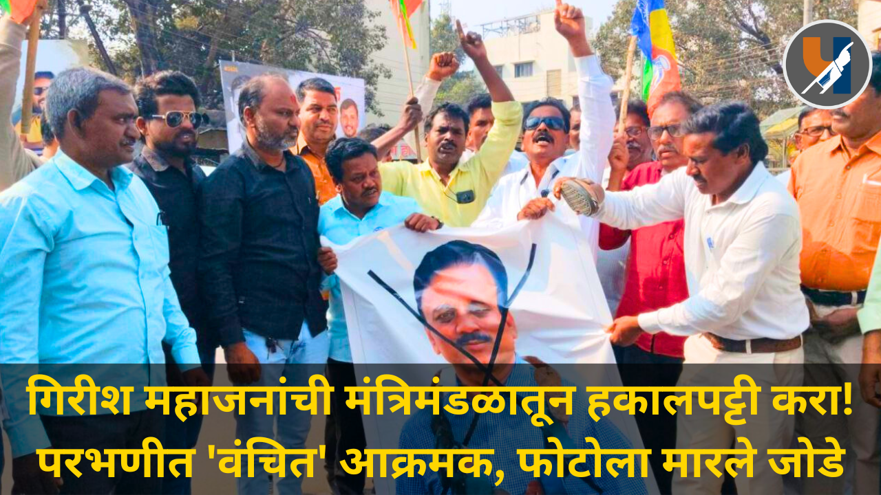 प्रजासत्ताक दिनाच्या कार्यक्रमात भाषणादरम्यान भारतीय राज्यघटनेचे शिल्पकार डॉ. बाबासाहेब आंबेडकर यांचे नाव न घेतल्याने मंत्री गिरीश महाजन वादाच्या भोवऱ्यात सापडले. या घटनेचे तीव्र पडसाद उमटत असून, परभणीत वंचित बहुजन आघाडीच्या वतीने महाजन यांच्या फोटोला जोडे मारून जोरदार निषेध करण्यात आला. “गिरीश महाजन यांची मंत्रिमंडळातून तात्काळ हकालपट्टी करा,” अशी मागणी यावेळी करण्यात आली.