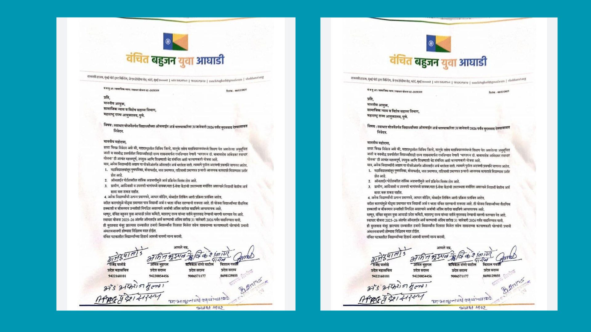 प्रदेश महासचिव राजेंद्र पातोडे यांच्या पुढाकाराने हे निवेदन देण्यात आले आहे. अनुसूचित जाती (SC) व नवबौद्ध प्रवर्गातील विद्यार्थ्यांना शिक्षण घेताना मोठा आधार देणाऱ्या या महत्त्वाच्या योजनेपासून अनेक पात्र विद्यार्थी अर्ज न भरल्यामुळे वंचित राहण्याची शक्यता असल्याचे युवा आघाडीने निवेदनात म्हटले आहे.